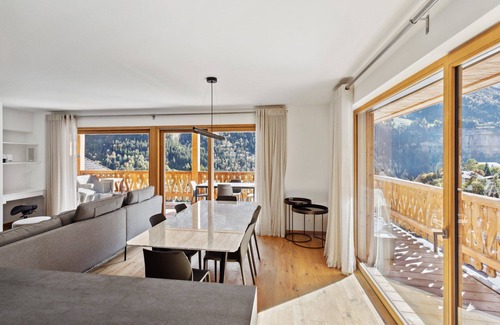 ** A security deposit request will be sent to you by email prior to your arrival date.Payment of this deposit is mandatory before you enter the property.The amount of the guarantee depends on the accommodation booked. **Sumptuous 3 bedroom apartment on the 3rd floor of the prestigious Montagnier by Mrs Miggins residence.Designed and created to the highest Swiss standards by an award-winning local architect, this apartment offers 154m2 of living space with a wide balcony of 47m2 offering stunning and direct panoramic views of the peaks and waterfalls of the Dents du Midi.The apartment offers a master double bedroom with en-suite bathroom, a bedroom with two single beds with shower room next to it and finally a children's bedroom with a bunk bed with its bathroom, so the apartment can comfortably accommodate up to 6 people.The Montagnier by Mrs Miggins features a wellness area with an indoor swimming pool, sauna and hammam as well as a gym, ski room, laundry room, concierge and Mrs Miggins' hotel services. --