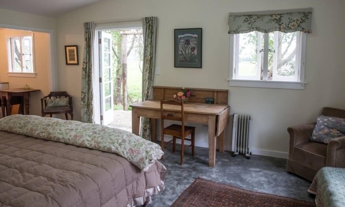 The good sized bed-sitting room opens out through french doors to a lawn bounded by a haha that provides easy, private out door living with a BBQ and wonderful views of the sunset through the Plain trees.
