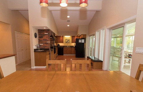 At the other end of the long hallway is the sunken living room, with vaulted ceilings, featuring another stunning tile fireplace, a flat screen television, and sliding glass doors lead to an outdoor deck with panoramic views of the lake. The entire house is outfitted with a surround sound system controlled in the living room, so bring your iPod and enjoy your favorite music!