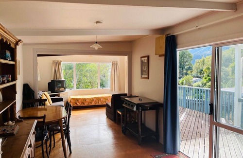 The bach is compact and tidy and yet has all the comforts and amenities to make it a treasured retreat away from home. It's open plan layout includes a dining and fully equipped kitchen area (with fridge/freezer, microwave, electric oven with 4 hobs) living area with a TV that plays DVDs, 2 bedrooms, and a shower room with separate toilet. The sitting room and kitchen both open out onto the deck. There is a sofa bed and a divan in the living room for extra guests (maximum house capacity is 6 people).