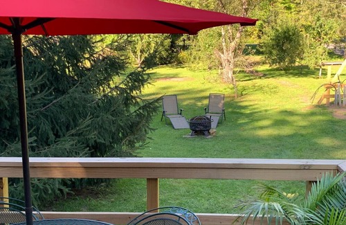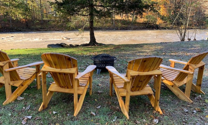 - Backyard: A grassy area with Adirondack chairs, a fire pit, and supplied firewood. Relax to the soothing sounds of the Esopus Creek nearby.
