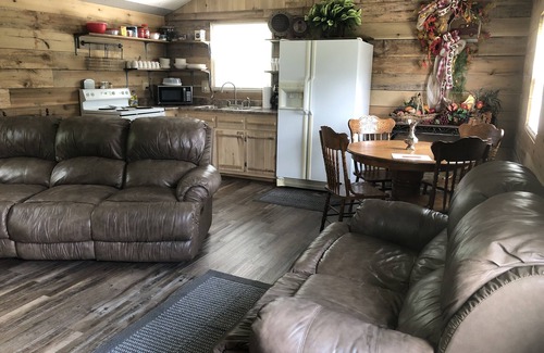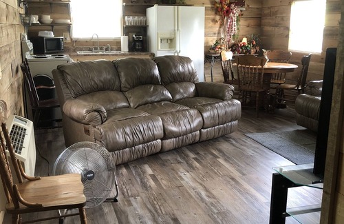 A beautiful cabin, (sits on one hundred acre farm) with one queen bed, full bathroom with laundry room, full kitchen dining room and living room combination, WIFI, TV is set for Hulu, Disney Plus, etc. Outside has a fire pit/grill and a gas grill, & much more to make for a wonderful time away from your home.