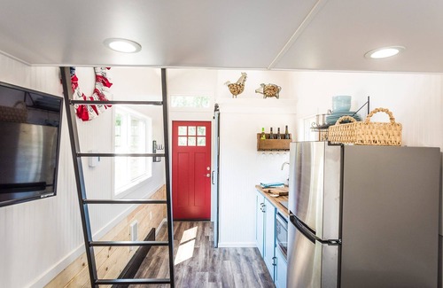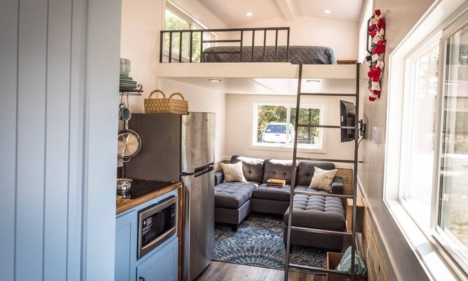 This home is 247 square feet complete with a sitting area, kitchenette, a sofa on the main level which forms another bed if needed, window A/C, and a queen loft.