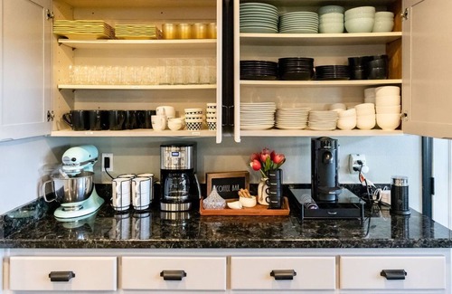 The full kitchen has various appliances (KitchenAid mixer, air fryer, slow cooker) and is fully stocked with pans/pots and two knife sets. Don’t worry about bringing olive oil, spices, coffee (regular ), or teas. The coffee bar has several coffee makers (regular, French press, and a Nespresso Espresso machine) and a tea kettle.