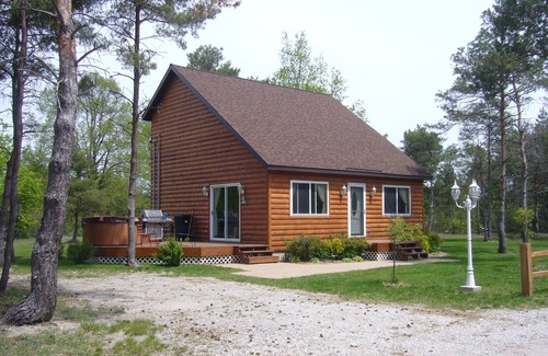 All Seasons Lodge is a serene year-round lodge with two stories, is a half log sided home, built in 2006, on 5 acres, a private drive, surrounded by red pine trees. Located just seconds form Crystal Mountain Ski and Golf Resort, closest vacation rental outside Resort. In its secluded location you can feel free to relax indoors or out. Perfectly located with plenty of activities, recreation and attractions, I'm sure you will enjoy all that the area has to offer. All Seasons Lodge home consists of three bedrooms and two baths, easily accommodating seven adults. The main level begins with a three-season porch with an outdoor hot tub. Walking in from the porch is the dinning room. The main living room displays a gas fireplace to warm up those cold nights. Located on the main floor is also the kitchen and one bathroom. Just at the bottom of the main level stairs is the first bedroom.
