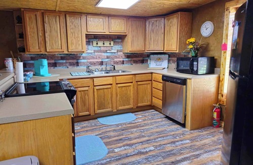 A unique cabin made with old railroad ties from the railroad that came through Bengal, Ok, in the early 1890,s . A charming living area furnished with train memorabilla and antique peices through out the cabin.