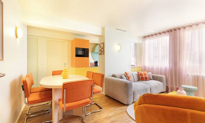 The apartment opens onto a spacious living room bathed in natural light, enhanced by a retro-chic decor thought through to the finest detail.