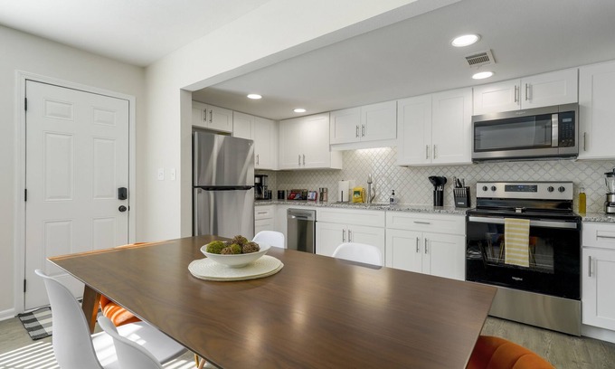 With three comfortable beds, a gourmet kitchen, and a cozy living space, this townhome can comfortably accommodate up to seven guests. If you want to soak up all the warm sunshine the “Sunshine State” offers, lounge on the patio or relax in the grassy backyard — complete with patio seating.