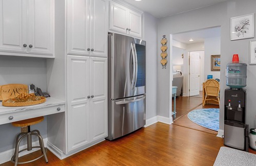 Just down the hall is a full bathroom with step in shower, and two of the four bedrooms. An additional passage bedroom is available. Pass through an open concept bedroom with twin bed and trundle to get to each of the private bedrooms on this floor. Each of the two bedrooms offers a queen bed and airy décor.
