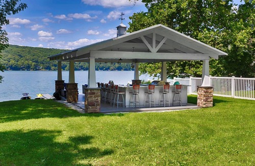 Open the doors from the lower level and walk down the path leading to the lakefront. There you'll find the outdoor kitchen and lounge area. This space is perfect for enjoying the view while staying shaded from the sun, especially when you turn on the ceiling fans on to allow extra comfort on a hot summer day. A Wave From it All will quickly feel like "home away from home."