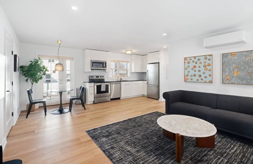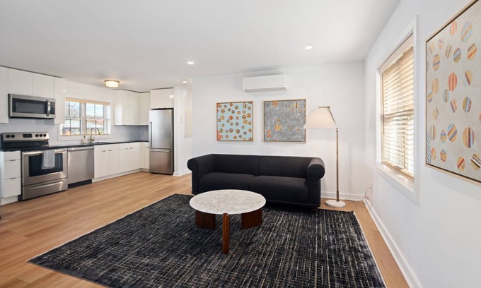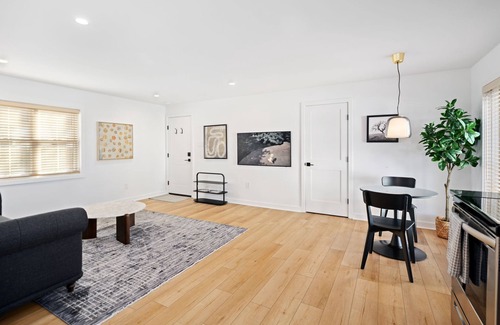 Welcome to this stylish one-bed, one-bath first-floor unit. Thoughtfully curated and designed with an open layout. The kitchen, living and dining areas flow seamlessly, creating a spacious and inviting space. Furnished with modern finishes and stocked with all kitchen essentials, this unit provides all you need for a comfortable and enjoyable stay.