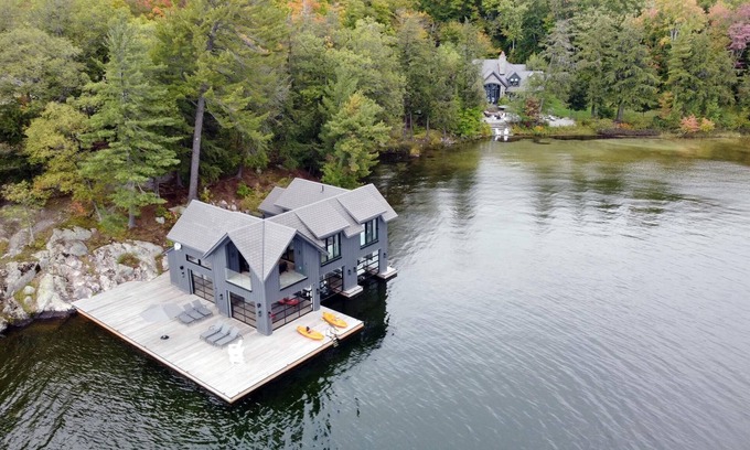 MARGARITAVILLE will treat you to peace and privacy immediately upon arrival, with the surrounding woods acting as a natural barrier from the rest of the world. Enjoy Muskoka beauty with south views of Lake Joseph in an extremely quiet bay. As you circle around to the south-facing reverse side of the cottage, you find yourself just steps from one of the Muskoka regions most-sought-after bodies of water: Lake Joseph. Margaritaville does an excellent job bringing together modern design with subtle nods to the traditional. The numerous windows allow for the pouring in of natural light and the sharp white walls reflect that light, creating an unforgettable space. The thoughtfully-finished wood and brick touches adds elegance along with the neutral tones, allowing the outdoor beauty to be appreciated at all times. The cottage is full of high end finishes and creative decorative design elements - all-marble kitchen countertops, two side stone fireplace, stunning wood floors and unique decorative windows, fixtures etc. There are a number of seating areas on the main level including the all-season Muskoka Room and the upper level that divides into two separate wings, allows for multiple lounging areas for you and your 17 other guests. The WOW factor continues at the waterfront with the newly built boathouse with 2 additional bedrooms, full bath, multiple kitchenettes, and a few indoor/outdoor lounging and living spaces.