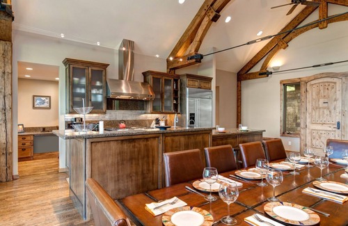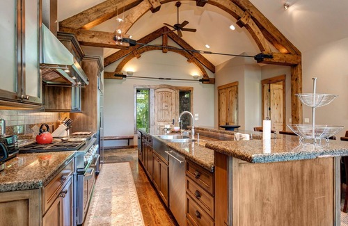 The chalet's décor is tasteful in every way. From cream colored couches to the rustic stone fireplace, this home epitomizes understated elegance. The windows and mountain views beyond take center stage, yet the focus on comfort within the home brings a sense of cozy hominess one seeks in a country home. The vaulted ceiling over the home's common spaces—kitchen, dining room and great room—make for an airy, spacious environment by which you and your friends and family will happily enjoy quality time. What's more, the state-of-the art kitchen is the foodies dream—a professional-grade stove and stunning granite countertops make meal preparation easy and fun.