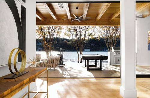 The Above Diamond is a waterside contemporary home overlooking Lake Austin. Facing Lake Austin, this property offers immediate access to the water; your boats are steps away providing daily opportunities for a quick spin. Maximizing the lake view, the home opens to a large terrace bordered by a negative-edge pool that seems to spill into the water below; you will be drawn outdoors again and again to enjoy an alfresco meal cooked up in the summer kitchen, followed by a cozy nightcap around the fire.