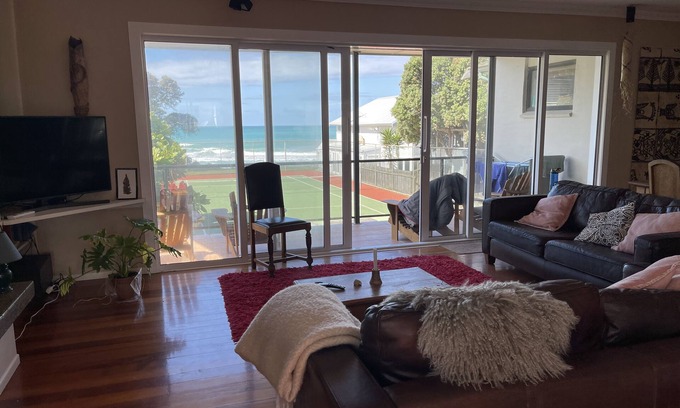 Apartment on Second level of House with family members in separate Ground Floor Apartment. Shared Driveway, Tennis Court and Beach Access Steps. Walk down rustic beachfront steps to the beautiful white sands of Wainui Beach situated on the Stock Route Surf Break. Furnished in an eclectic style where you can't help but feel comfortable. Sit out on the balcony that overlooks the Ocean and if you're up early check out the beautiful sunrise. In the evening check out the stars and the rising moon. On the western deck you can fire up the BBQ and enjoy the alfresco dining with views out to the hills and capture the last ray of sun for the day. The property also features a full tennis court, enjoy a game when the surfs not up and its also a safe haven for the children play or ride their bikes around. You can relax or do your yoga right on the beachfront while you check out our local world class surfers in action. This is what a holiday is all about! Little fluffy dog called Beau lives with family downstairs.