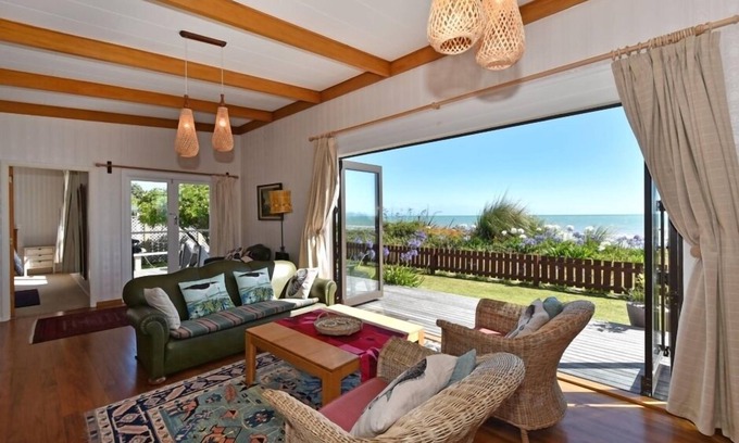 The polished timber floors in the living area are a lovely feature, along with the log burner fire and bifold doors to the large deck. The extensive open plan living area and wooden deck along the front of this classic beachside home offer you panoramic views from Farewell Spit to Separation Point. The large open plan living area and deck allows for entertaining and accommodating family and friends, and there is a spacious, well equipped kitchen. There is plenty of outdoor furniture and a quality BBQ for outdoor entertaining and relaxing.