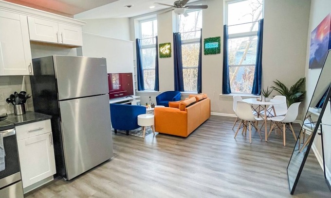 This stylish place to stay is perfect for a group of 4! It offers high ceiling's that give it a loft style feeling. The windows are about 10 feet high offering as much natural light as you can get!