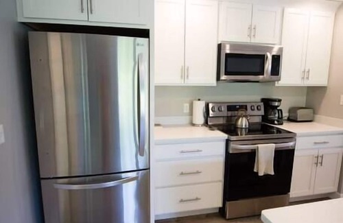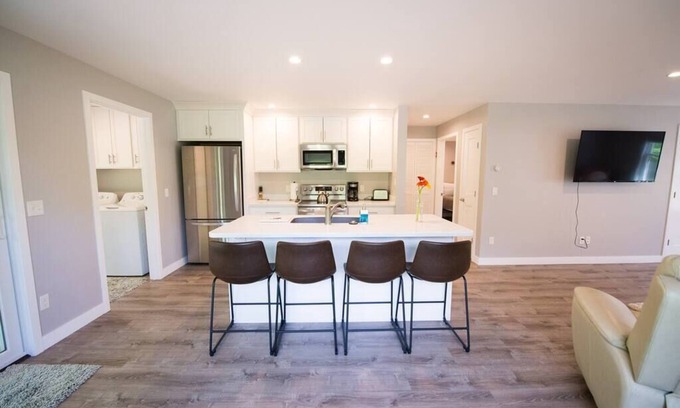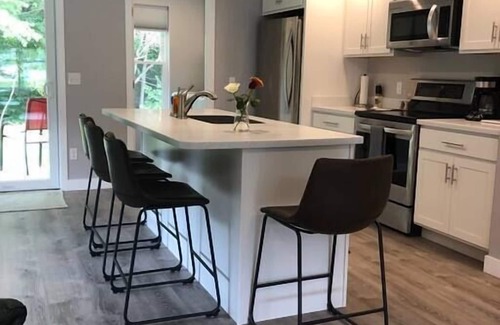 This new, open concept modern design suite is one of our most popular rentals. It's central location, modern design, and accessibility keeps guests coming back year after year. The Winter Street suite is in walking distance to many amenities, including downtown Brunswick, the Topsham Fair Mall, movie theater, and multi-cultural restaurants. This space has all that you need from in-unit laundry room to high-end appliance. Working remotely? No problem! The suite has high speed wireless internet and a workstation with basic office supplies. This comfortable and sunny suite is accessible for guest with mobility challenges, with a low threshold into the entry/back patio and a curb-less custom-tiled shower.