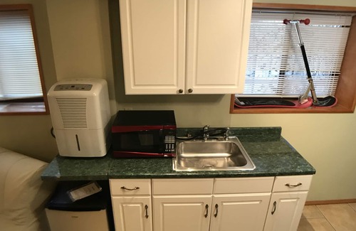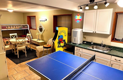 Lower level game area/ bedroom suite with walkout to deck. Has its own small kitchenette- a big favorite with our guests. This is a huge cabin - over - 2,900 sq ft of hardwood and tile floors - so a family can spread out and relax.