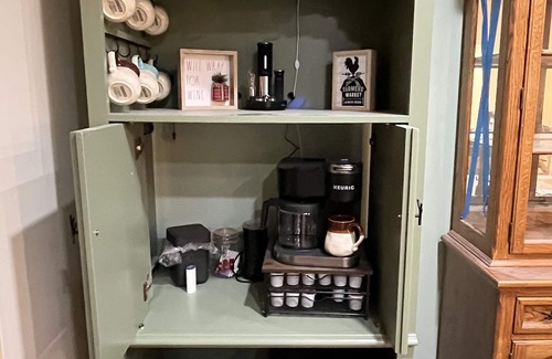 The kitchen /dining area is fully equipped with fridge, microwave, electric stove, and dishwasher and basic kitchen essentials. There is also a coffee/wine bar with a wine fridge, Keurig Duo, milk frother and coffee cups and wine glasses. We provide a few coffee pods/ tea bags for your first morning but ask that you supply your own beyond that. There is a dining room table with seating for 6 but there a extra leaves next to the coffee bar in case you need more seating.