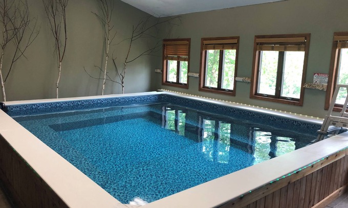 The Guests House at Eagle's Landing is certainly a unique rental building with an indoor pool and hot tub, you don't need to go out in the cold. The rental is 4 miles from Gore Mountain, 8 sprawling wooded acres with waterfront area on Mill Creek. Multiple rental buildings make up the property. Also the owner is available for a questions, fixes, recommendations, and help making reservations with nearby attractions, restaurants, and tours. The Guest House at Eagles' Landing is a 2,300 sq ft building with indoor heated pool and hot tub. The GuestHouse has two bedrooms each with a queen sized bed and private sink area. There is also a bunk room with 2 bunk beds (full on bottom and twin on top). A common living room with pull out sofa equipped with Satellite TV. Full kitchen with large dining table. In this building there are two full bathrooms each with shower and a washer and dryer for guest to use. The entire building has radiant heart and in the summer window units for air conditioning. Building has a large paved parking area.
