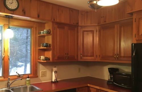 This is an all season retreat tucked in among pine trees, in your own little slice of heaven. The Kitchen, Living Room and Dining area are an open floor plan. It creates a nice common area. Covered screened in porch to have your coffee in the morning. or evening cocktail. The Kitchen is stocked with everything you would need pots,pans,glasses,silverware,cooking utensils,microwave,coffee maker etc.