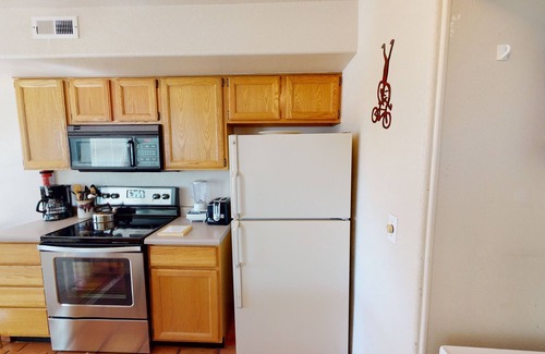 Located just 5 miles south of town, this condominium offers panoramic views and a relaxed atmosphere next to the 12th hole (and lake) of Moab's year-round golf course. This desert themed, two bedrooms, two bath condominium sleeps 7 and is located in the Solano Vallejo condominium complex next to the Steelbender OTV trail. This unit has spectacular views of Moab's West Rim with a private patio that includes a propane BBQ grill and afternoon shade from trees and other foliage. Enjoy an evening cookout or a quiet outdoor breakfast as you feast your eyes on the serene, deep red views of the Moab Valley. Bike and jeep trails, as well as petroglyphs, are within a ½ mile of this unit. A unique, quiet walking trail located directly behind this unit, takes you along the golf course with even more gorgeous views of the West Rim. Inside the unit, the Indian Rock motif and authentic fossils add a distinctive feel for Moab's historical connection to the ancient people of southeast Utah.