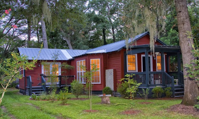 This house was originally built on the Marine base at Parris Island. Moved to Pigeon Point Road in the 50's and then moved again in 2001 to it's present location on Laudonniere St. It was just 14' by 42' (a shotgun house) . We added two bedrooms & two baths. In 2008 we added a fireplace bay and a dinning bay in the living room and two walk-in closets in the bedrooms +made a coat closet in the hallway. It is now a full functioning house with cathedral ceilings and fans throughout, heart pine flooring and even a claw-foot bathtub. Most people who walk in the front door for the first time fall in love with it.