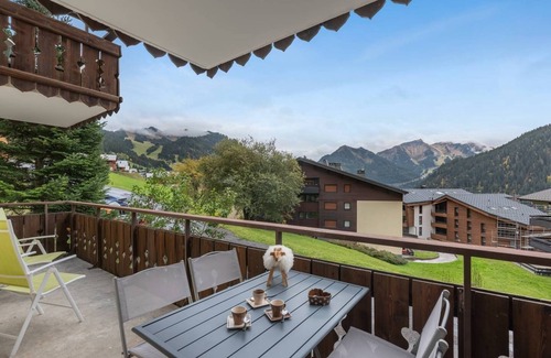 The flat has a balcony with an outdoor table and views of the valley and surrounding mountains.