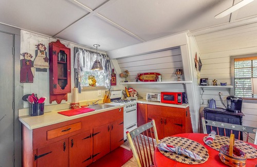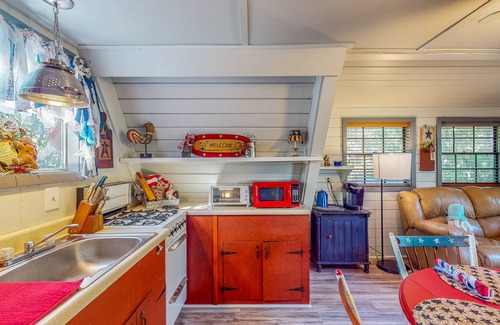 Spend lazy afternoons casting a line off the pier, then kick back with a crisp drink in the charming swing. A covered deck invites cookouts at home with a gas grill and alfresco dining. There's a cold-water outdoor shower for easy cleanup and a wood-burning firepit for cozy conversations under the stars.