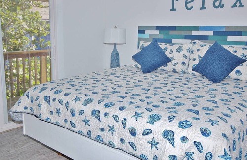 The master suite is the jewel in the crown of this home, featuring a king-sized bed, direct deck access, and close private bathroom. The bathroom is just as well-appointed, with a gorgeous walk-in shower. The second bedroom strikes a surfer vibe. With one queen-sized bed, this bedroom is convenient to the second bathroom, which continues the island motif and boasts a combination tub/shower.