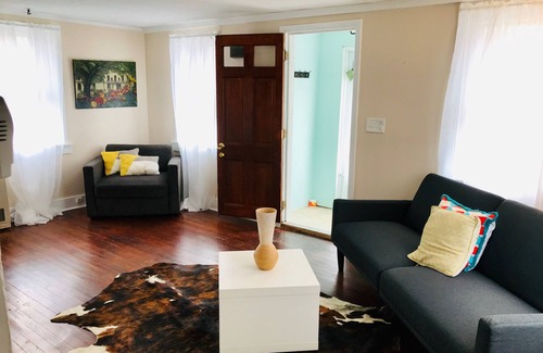 Sweet loft on quiet dirt road. First floor has kitchen, eating area, living room, bathroom with laundry, three season porch overlooking private back yard, deck. Second floor is an open space with two sleep areas. One sleep area has a queen bed. The other sleep area has two twin beds. Quiet dirt road and pond to explore.