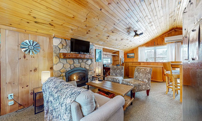 This vacation rental boasts a well-equipped kitchenette, a pub-height dining table for meals or family board game nights, and a sunny and inviting living area with a warming gas fireplace and a TV for streaming all your favorite channels. Step outside and explore the beautiful flower gardens complete with a koi pond, enjoy your morning coffee or afternoon tea in the gazebo, or slip into the shared pool for the perfect afternoon at home. In the evenings, meet up around the fire table as the stars dot the night sky overhead.