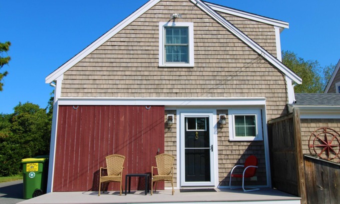 You will find a delicate mix of Cape Cod charm and equine passion in this spacious and bright apartment featuring a large grassy lawn abutting meticulously maintained working horse paddocks. The front door enters into the large foyer highlighted by beautiful reclaimed wood framed windows separating the foyer and the living space. The open floor plan of the kitchen and dining space is separated from the living space by a handy island with two stools. There is a half bath with a washer and dryer on this floor as well. The living space spills out to the back yard where you can grill and dine alfresco in peaceful privacy while absorbing the beauty of the majestic horses in their paddocks. The second floor offers a large bathroom with a walk-in shower. The vaulted ceilings in the bedroom (with queen bed) accompanied by the cozy sitting space create a relaxing and welcoming space to read a book or take a nap. There is a large walk in closet with shelving for all your storage needs. Stroll over to adjacent Forget Me Not Farm where fresh eggs and flowers are frequently offered. Convenient to conservation land with nature trails, pristine Cape Cod beaches, and Harwich center, the making of an ideal vacation is all possible from this great apartment! For your comfort, there is a mini spit on each floor. There is parking for two cars on premises. 2 night minimum bookings available off season with an added cleaning fee. 7 night bookings includes the cleaning fee. BOOK NOW! An administrative fee and applicable taxes may apply. Linens not provided. Guests may rent linens or bring their own.