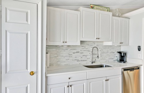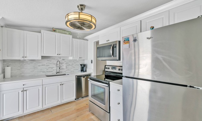 If you're looking for a beautiful, beachy, immaculate place to stay, look no further! This 1 level spacious Villa features high ceilings, an open floor plan and is light and bright throughout. This unit is the largest model in the complex! The ship lap walls separates the living room from kitchen adding the perfect amount of uniqueness. The stunning kitchen is upgraded with cortez countertops, glass/porcelain backsplash, white cabinets and stainless steel appliances. The large master bedroom has his and her closets with lots of storage space and vanity space. The back porch has a new white vinyl privacy fence to sit outside and relax. This unit has been upgraded to central A/C.