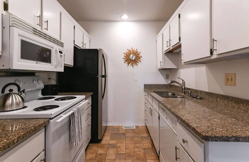 - Kitchen- Fully equipped with a gas stove, refrigerator, oven, dishwasher, microwave, toaster, and coffee maker. We offer coffee, sugar and creamer with your stay. Contains pots, pans, cutlery and other necessary items like oil, sugar, salt and pepper. We also have plates/cups/silverware.