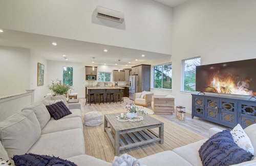 Inside, the home is spacious and inviting, with high ceilings, large windows, and beautiful finishes throughout. The second-floor great room is the heart of the home, featuring a large sectional sofa, window-side seating, and a cozy atmosphere for conversation or quiet afternoons. The open kitchen is fully equipped for everything from casual breakfasts to celebratory dinners, and the adjacent dining table comfortably seats a full group.