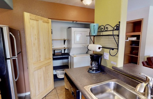 On the main level, the living/dining area provides a comfortable gathering space, where after a full day of activities, you’ll enjoy the cozy ambiance of the gas log fireplace. The dining table seats 4 and there is additional seating via stools at the snack bar. The pass-through kitchen is fully equipped with dishes and cookware. Appliances include dishwasher, range, built-in microwave, refrigerator/freezer, and coffee maker. A stackable washer/dryer is provided in the laundry closet off the kitchen. You’ll also have secure storage for your car and recreational toys in the attached, single car garage. Topping off this vacation home is the private patio that faces the golf course, equipped with a picnic table and a propane BBQ grill. Enjoy an evening cookout or a quiet outdoor breakfast as you feast your eyes on the verdant expanse of the golf course, contrasted beyond by the deep reds of the West Rim of Moab Valley.
