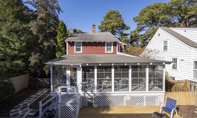 AFFORDABLE LISTING IN OCEAN BLOCK - "THE PINES". Cherished memories are sure to be made in this classic Rehoboth Beach home located just steps to the sand and surf of beautiful Deauville Beach or play tennis. Sleeping 8, there are 3 bedrooms in the main house and 2 additional bedrooms in the 2nd floor detached apartment. After a glorious day at the beach, cool off in the lovely outdoor shower and then unwind on the fabulous screened porches: relax, read, play cards and games or . . . enjoy coffee, cocktails and dining on one of the TWO spacious screened porches. Dining in? The home offers a charcoal BBQ grill and fully equipped kitchen for the chefs in the group. Dining out or hitting the boardwalk for games or rides? No worries... keep the car in the driveway and enjoy a short stroll on the boardwalk into the downtown area. Rehoboth Beach is well known for its fabulous boutiques and the wonderful selection of both delicious casual fare and outstanding gourmet restaurants. Other fabulous features include an "office" if anyone needs to keep in touch with colleagues, washer/dryer, a fabulous outdoor shower, a yard for the kids to play and plenty of off-street parking in the driveway. Bonus: the owner graciously provides 2 Rehoboth Beach parking permits too! Feeling adventurous? Rent or bring your bike and hop the scenic Gordons Pond Bike Trail in adjacent North Shores and you'll be in Historic Lewes in no time. Definitely worth a day visit to the "First Town in the First State". No Pets or Smoking Please.