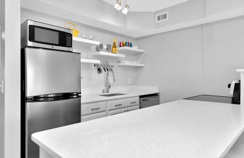 Make your favorite seafood meals or a picnic lunch for the beach in this cute kitchen! Fully equipped with stainless steel refrigerator, microwave, oven/stove, and dishwasher. Washer and dryer too! Charcoal grill on premises. Also comes with a beach cart and two chairs!