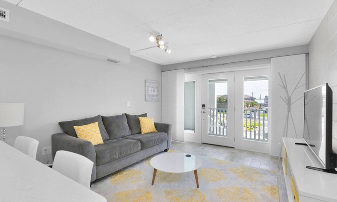 Enjoy a late night movie on the large flat screen TV from the comfy living room sofa or head back to your bedroom for a great nights sleep in the cozy queen bed. From the bedroom step out onto the north facing, private balcony and take in some fresh gulf air and sunshine. The bathroom, with walk-in shower, is located in the hallway just outside of the bedroom for easy access.