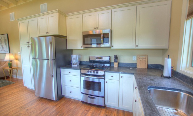 Featuring a king-sized bed, spacious tiled bathroom, open plan living room, and fully equipped kitchen. Freshly decorated with local art and contemporary furnishings, and all countertops of locally quarried soapstone. Solar shades in the rooms with views and room-darkening shades in bedroom and bath. Electric fireplace in the corner can warm you on a chilly night, or create that intimate ambience when you're ready to snuggle in for the evening. 650 private square feet with a deck overlooking the wildflower meadow.
