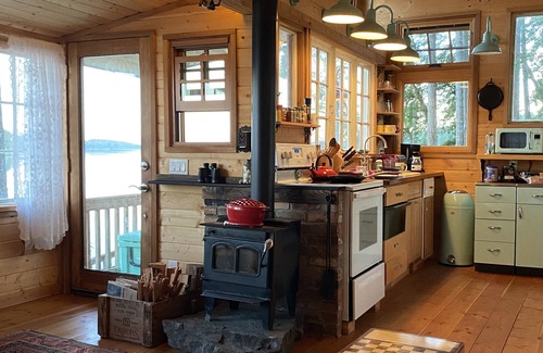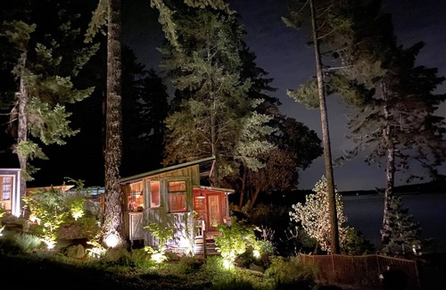 These two cabins can be rented together. The Church, or Ahabs’ is available to guests renting the Captain's Cabin. Ahab’s stained glass wall of windows sparkles with multi colored light, while the other wall of windows affords a floor to ceiling view of the water and garden. The full sized bathroom lit with chandeliers, features an antique, six foot cast iron clawfoot tub and shower.
