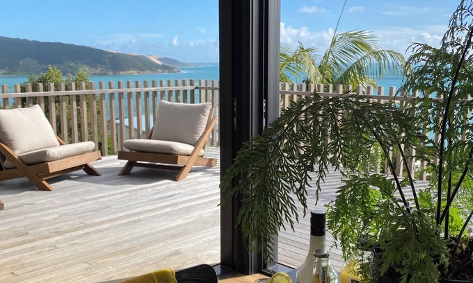 Architecturally designed modern home with views of the Tasman sea from every window. Enjoy a calm, relaxing holiday in this stylish space.