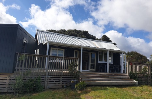 Cute house with large flat section with 1 bedroom (queen bed) and a separate cabin (double bottom, single top bunk bed). Huge wrap around deck with tables and chairs, hammocks. Farmland, forestry and glimpse of the ocean views from the deck. Kids tree hut, sandpit and swings.