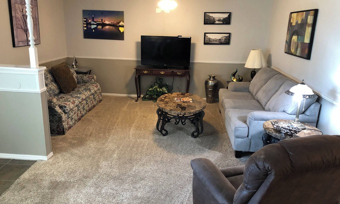 Kick back and relax! This home offers privacy in a family friendly neighborhood convenient to I-35. Easy to get to parks, recreation, shopping, worship places, and entertainment. Consider this place your home away from home while you visit the area. Whether you need a place a few days or a few months, this neat home may be perfect for you! The big living room has a ceiling fan, 2 couches, and one is a queen-size pull out sleeper sofa couch. Settle in to the comfy rocker recliner to kick back and relax or watch TV. The big Smart TV has HD antenna. The big sturdy desk in the main entry room is great for work or study. When you have work to do, the sturdy large desk will accommodate you with good lighting and good WiFi! Kitchen with lots of cabinet space & plenty of dishes & cookware! There is a laundry room off the kitchen and back porch with full size washer & dryer. The east facing backyard is fenced, has a big covered patio, LED string lighting, BB-Q grill, & patio table & chairs.