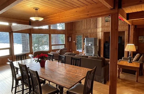 The lower floor of the house is almost all open concept, which is great for family time together. There is a "living room" section with two leather chairs that look out through floor-to-ceiling picture windows at the spectacular view. An arm chair and a couch complete this area. There is a dining table made from reclaimed wood that seats 10. There is one larger bedroom on the lower floor that has sliding door access directly to the outside deck. This bedroom adjoins a full bathroom.