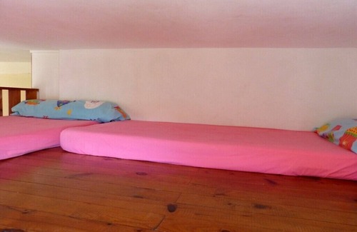 It consists of a bathroom with bath, a kitchenette, a living room with round table, a sleeping area with fixed bed in 140. In the mezzanine two beds in 90 for children.