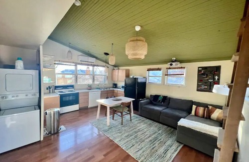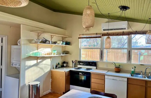 This guesthouse has high ceilings and tons of natural light. The living area is a wonderful place to relax or have a cup of coffee and plan your day in the eat-in kitchen. The guesthouse features a full-sized washer and dryer, over-sized projection screen, comfy couch and a dedicated workspace in the bedroom.