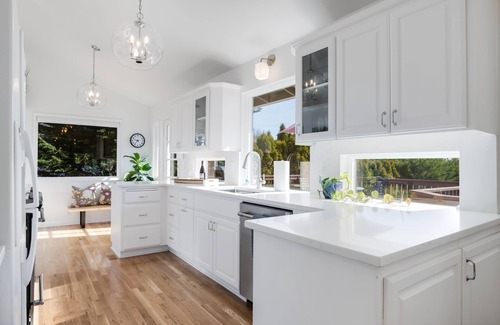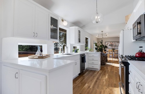 The home features a fully equipped kitchen with updated appliances, lots of space for cooking, and gorgeous quartz countertops. You'll find everything you need for preparing almost any dish! Serve up that perfect meal to family and friends with a dining area with seating up to six guests. Wake up the next morning with a fresh cup of Caravan Coffee, courtesy of Lifestyle Properties. The charming kitchen is designed to help you whip up a tasty dish, or put together an appetizer plate to go with your wine. Set out a few small bites on the kitchen counter or dining room table while you indulge in a bottle of local wine.